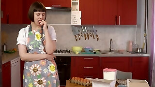 Petite boobs solo babe Sandy Cheeks masturbates in the kitchen