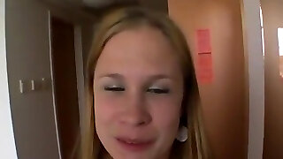 Ugly blonde woman sucks a strong hot dick for gloppy cum right in the hall