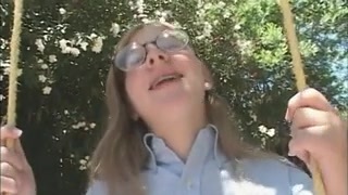 Ugly pale nerd in glasses Amy kneels down to suck a tasty cock for gooey cum