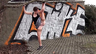 Rather flexible amateur ebony head pulls up one leg and pisses outdoors
