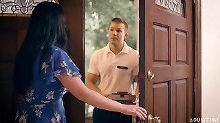 Pretty dark haired babe with juicy ass Emily Bender gives BJ and gets boinked