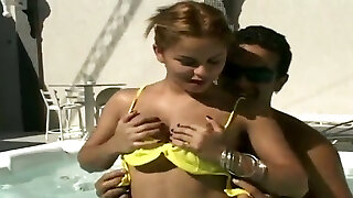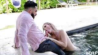 Bare ebony babe Lala Ivey is swimming in the pool before a crazy hookup with her milky neighbor